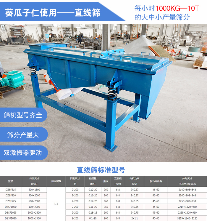 總結:直線篩相比旋振篩的優勢在於篩分產量上的提升,大型號的直線篩可滿足每小時10噸的產量求,大產量葵瓜子仁篩分就選直線篩!