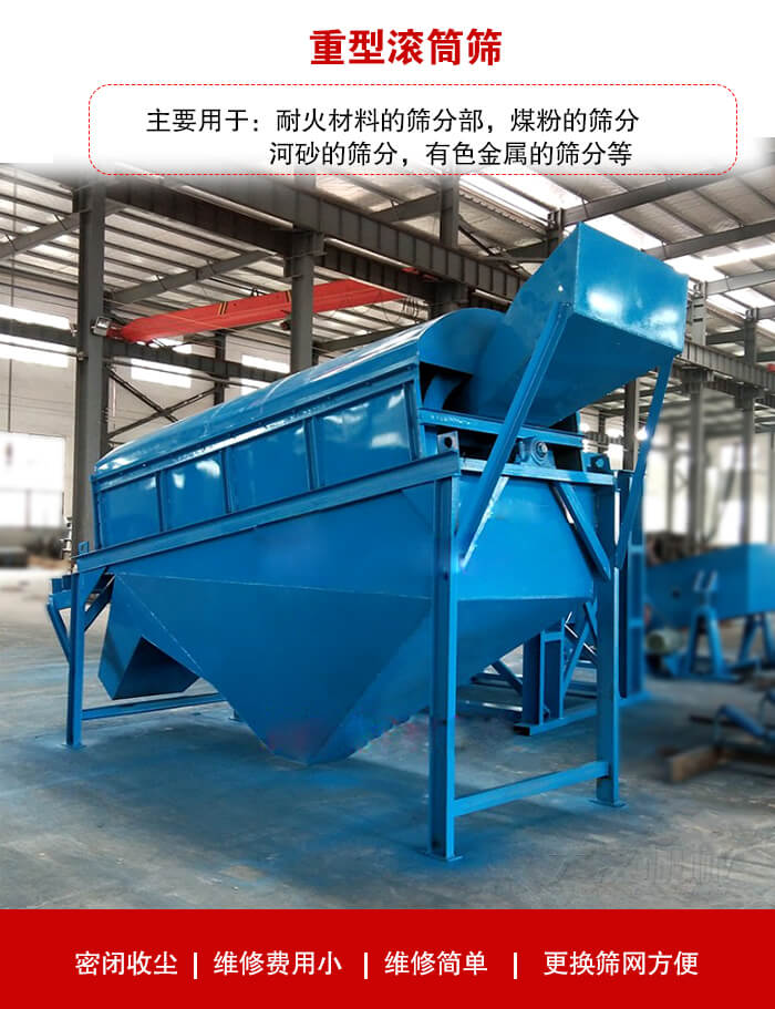 重型滾筒篩主要用於:耐火材料的篩分部,煤粉的篩分,河砂的篩分,有色金屬的篩分等。具有密閉收塵,維修費用小,維修簡單,更換篩網方便等特點根據不同用戶的篩分需求選擇:單層滾筒篩:主要分離出兩種粒度的物料。多層滾筒篩以及單層多段滾筒篩:可分離多種粒度的物料。
